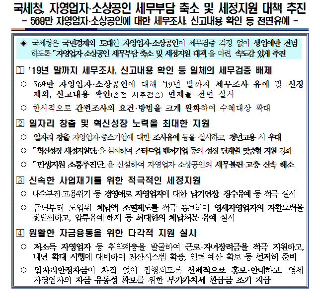 국세청, 자영업자·소상공인 세무부담 축소 및 세정지원 대책 추진