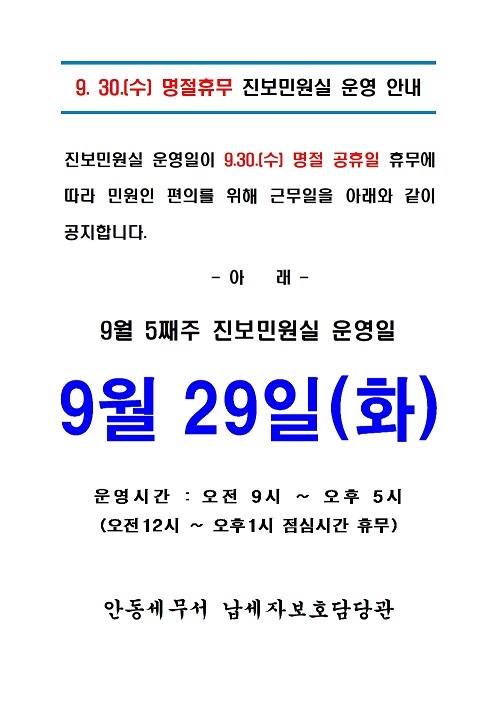 9. 30.(수) 명절휴무 진보민원실 운영 안내