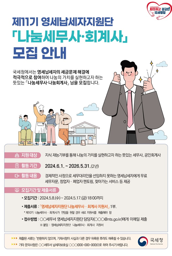 ◈ 지원 대상 -지식 기부를 통해 나눔의 가치를 실현하고자 하는 뜻있는 세무사, 공인회계사 ◈ 활동 기간 -2024.6.1. ~ 2026.5.31.(2년) ◈ 활동 내용 -경제적인 사정으로 세무대리인을 선임하지 못하는 영세납세자에게 무료 세무자문, 창업자・폐업자 멘토링, 찾아가는 서비스 등 제공 ◈ 모집기간 및 제출서류 -모집기간:2024.5.8.(수) ~ 2024.5.17.(금) 18:00까지 -제출서류:「영세납세자지원단 나눔세무사・회계사 지원서」 1부. ※ 제10기 나눔세무사·회계사가 연임을 원할 경우 새로 지원서를 제출해야 함 -접수방법:영세납세자지원단 담당자(○○○@nts.go.kr)에게 이메일 제출 ※ 붙임 : 영세납세자지원단 나눔세무사・회계사 지원서 북 광 주 세 무 서 |