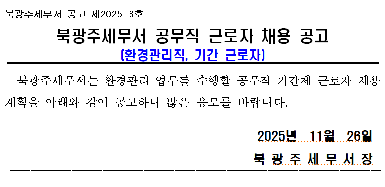 북광주세무서 공무직 근로자 채용 공고(환경관리직, 기간 근로자)
