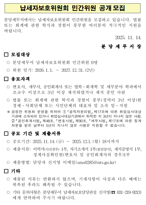 분당세무서 납세자보호위원회 민간위원 공개 모집