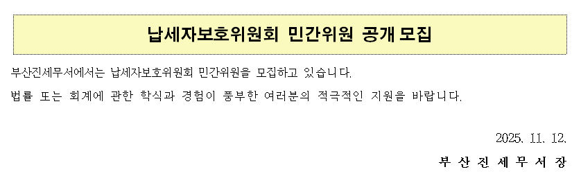 부산진세무서에서는 붙임파일과 같이 납세자보호위원회 외부위원을 모집하고자 합니다.
