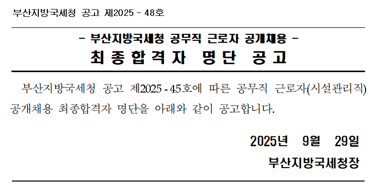 부산지방국세청 공무직 근로자(시설_소방) 공개채용시험 최종 합격자 공고