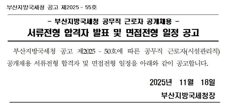 부산지방국세청 공무직 근로자(시설_소방) 공개채용시험 서류전형 합격자 공고