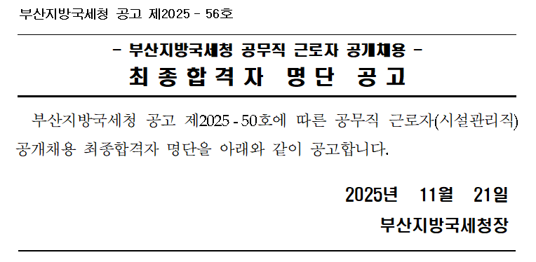 부산지방국세청 공무직 근로자(시설_소방) 공개채용시험 최종 합격자 공고