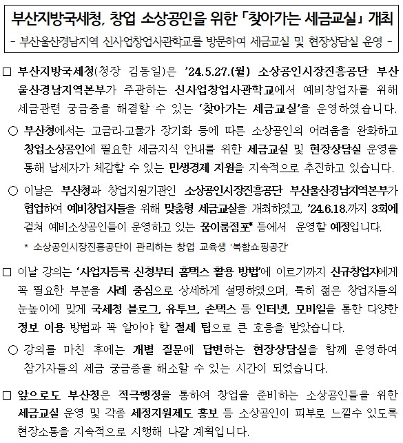 <부산지방국세청, 창업 소상공인을 위한 「찾아가는 세금교실」 개최>