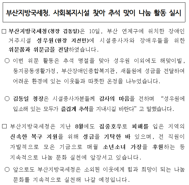 <부산지방국세청, 사회복지시설 찾아 추석 맞이 나눔 활동 실시>