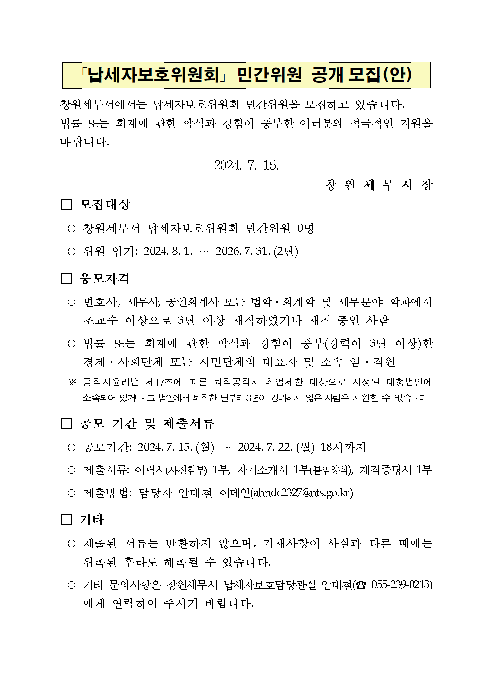 납세자보호위원회 민간위원 공개모집