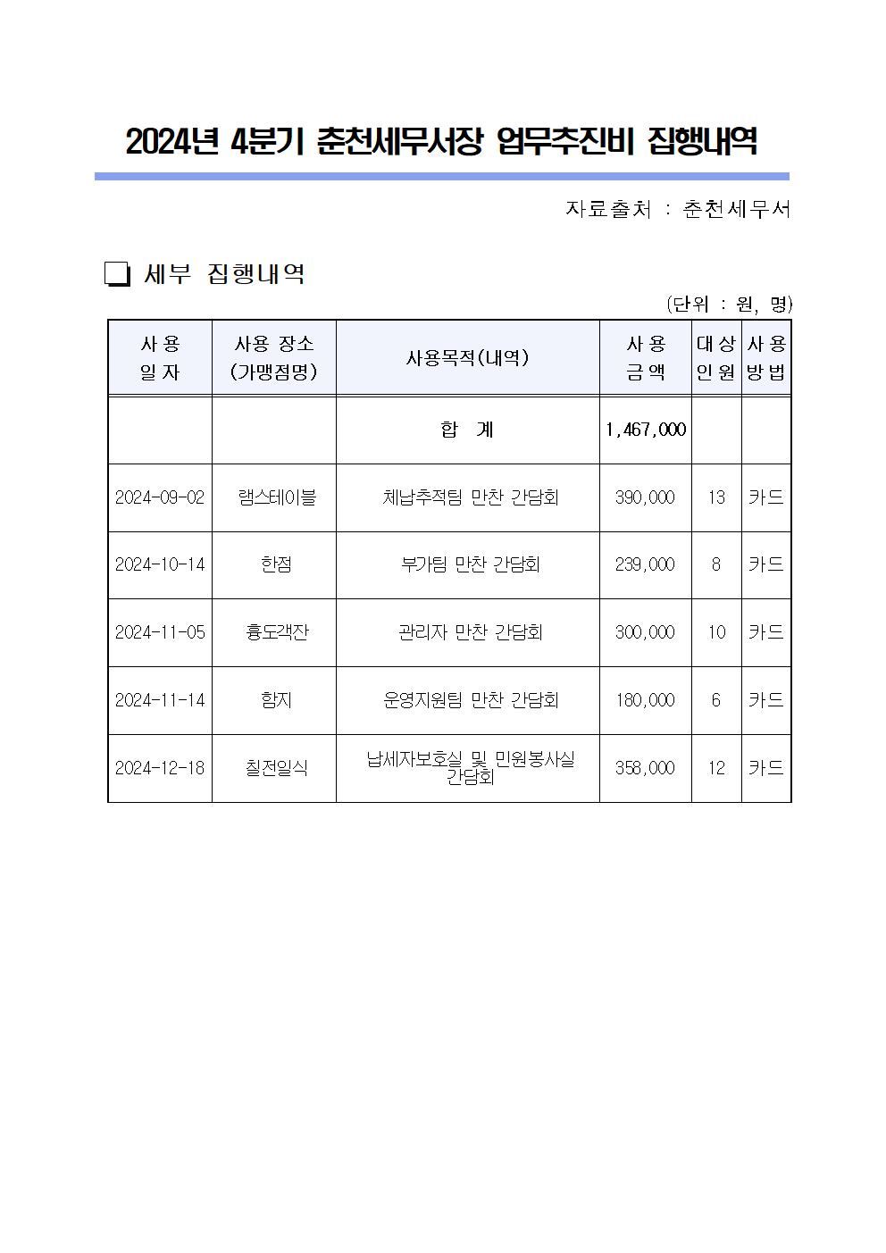 2024년 4분기 춘천세무서장 업무추진비 집행내역