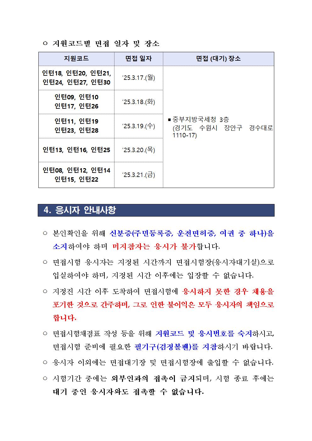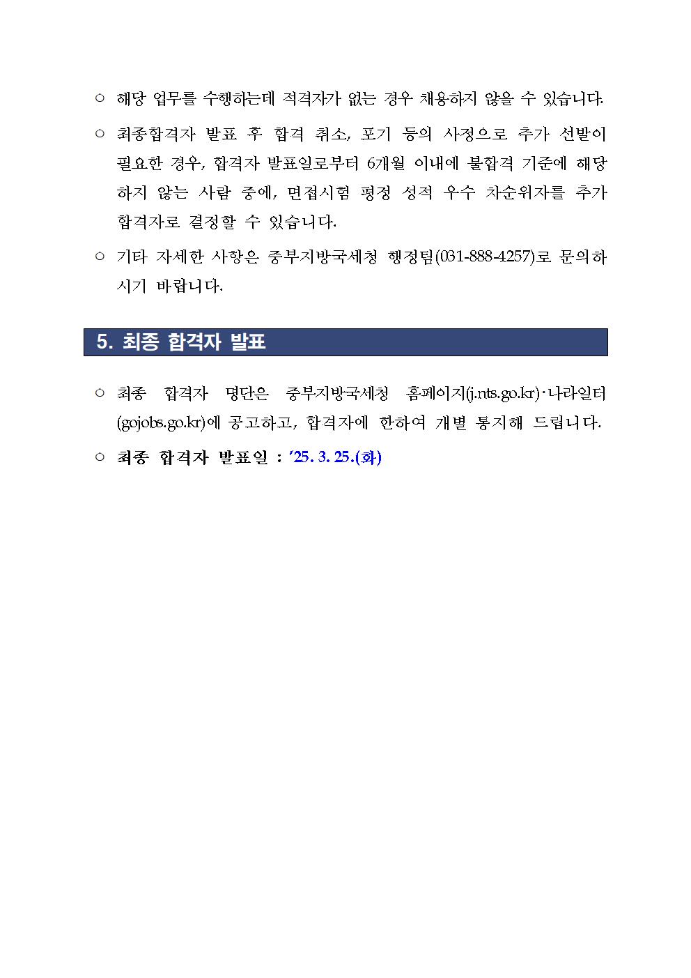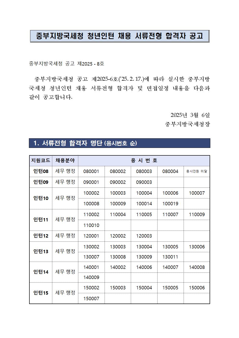 중부지방국세청 청년인터 채용 서류전형 합격자 공고