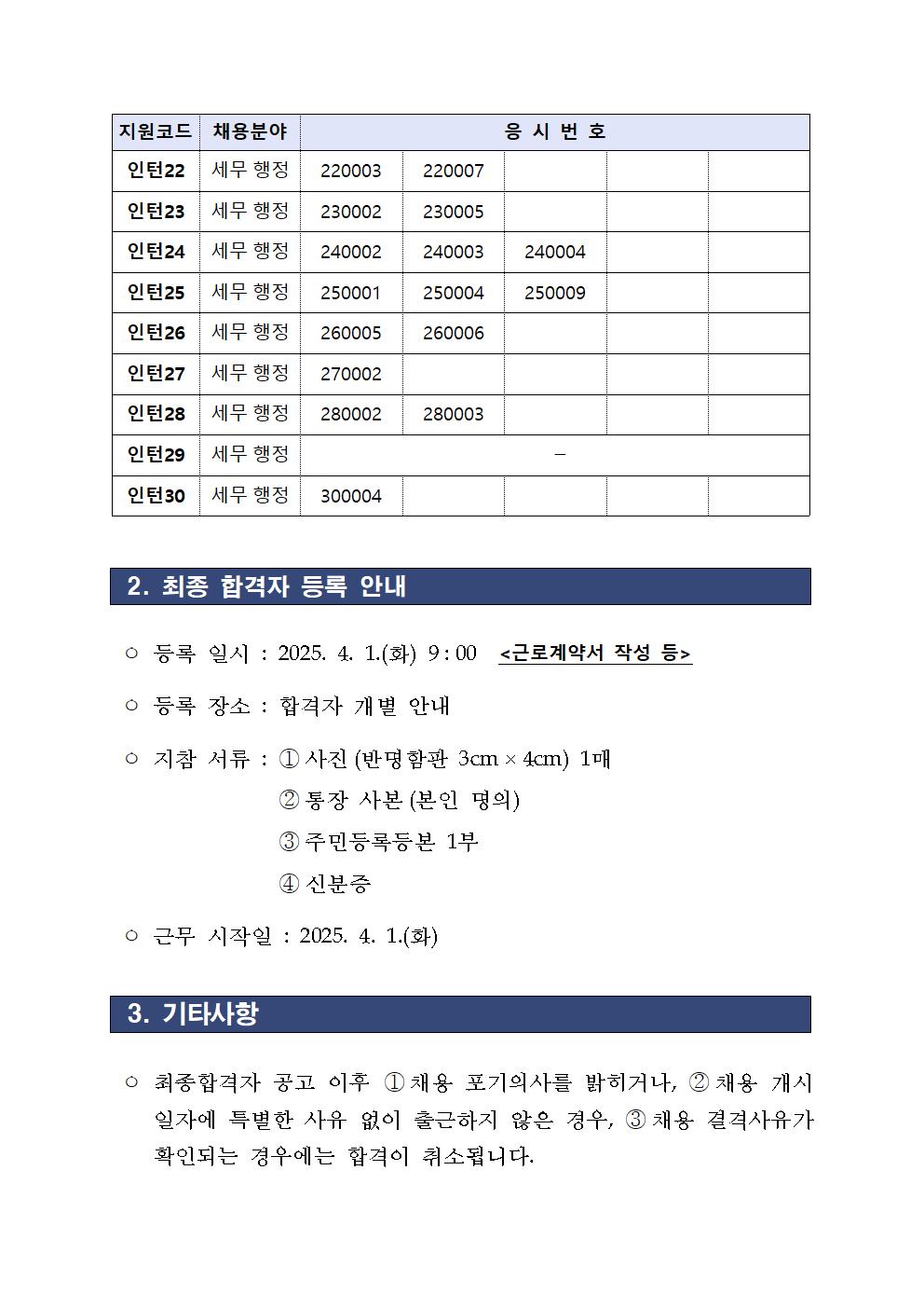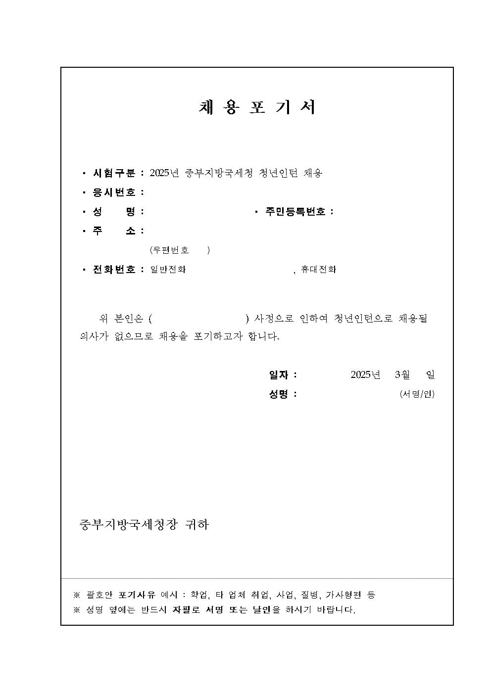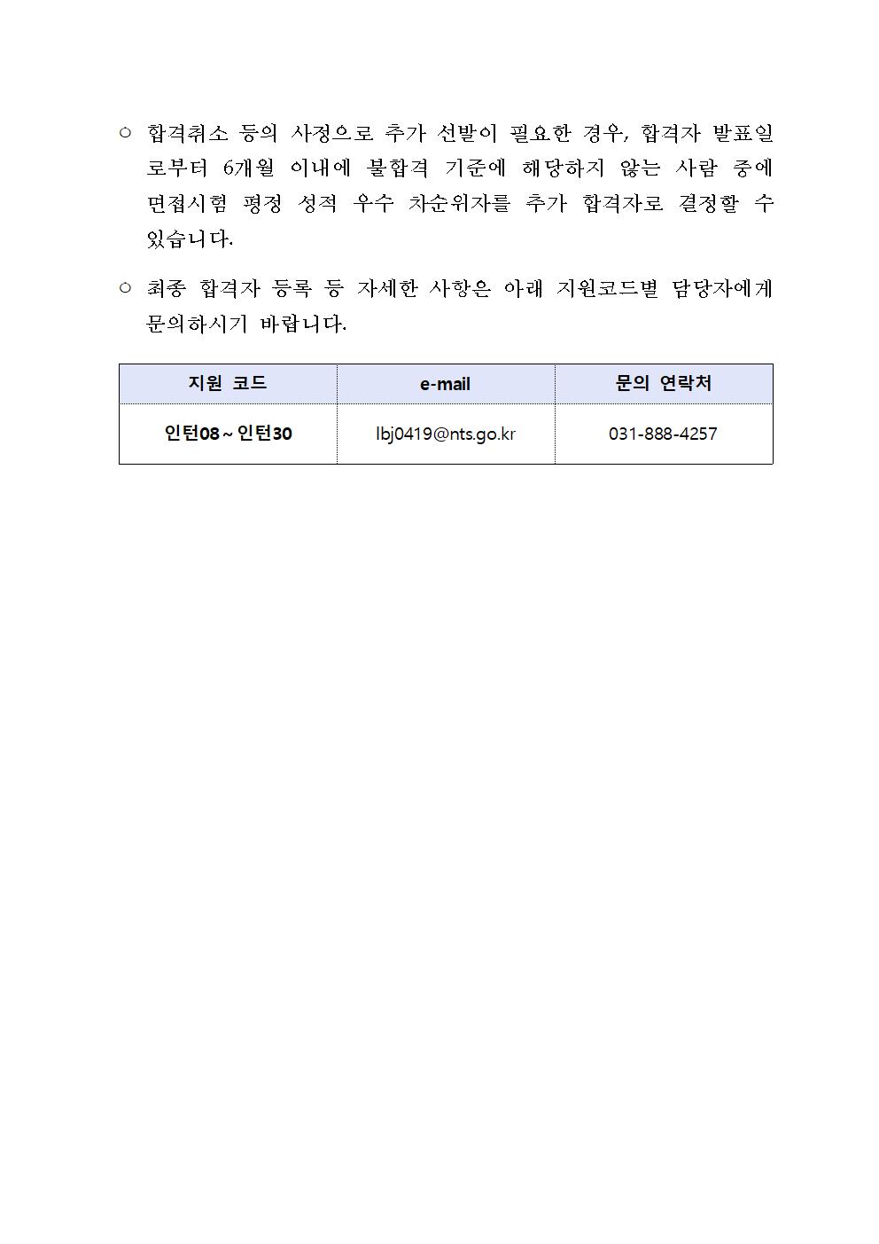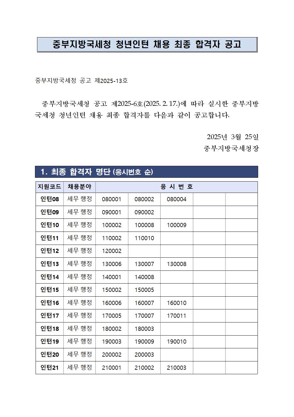 중부지방국세청 청년인턴 채용 최종합격자 공고