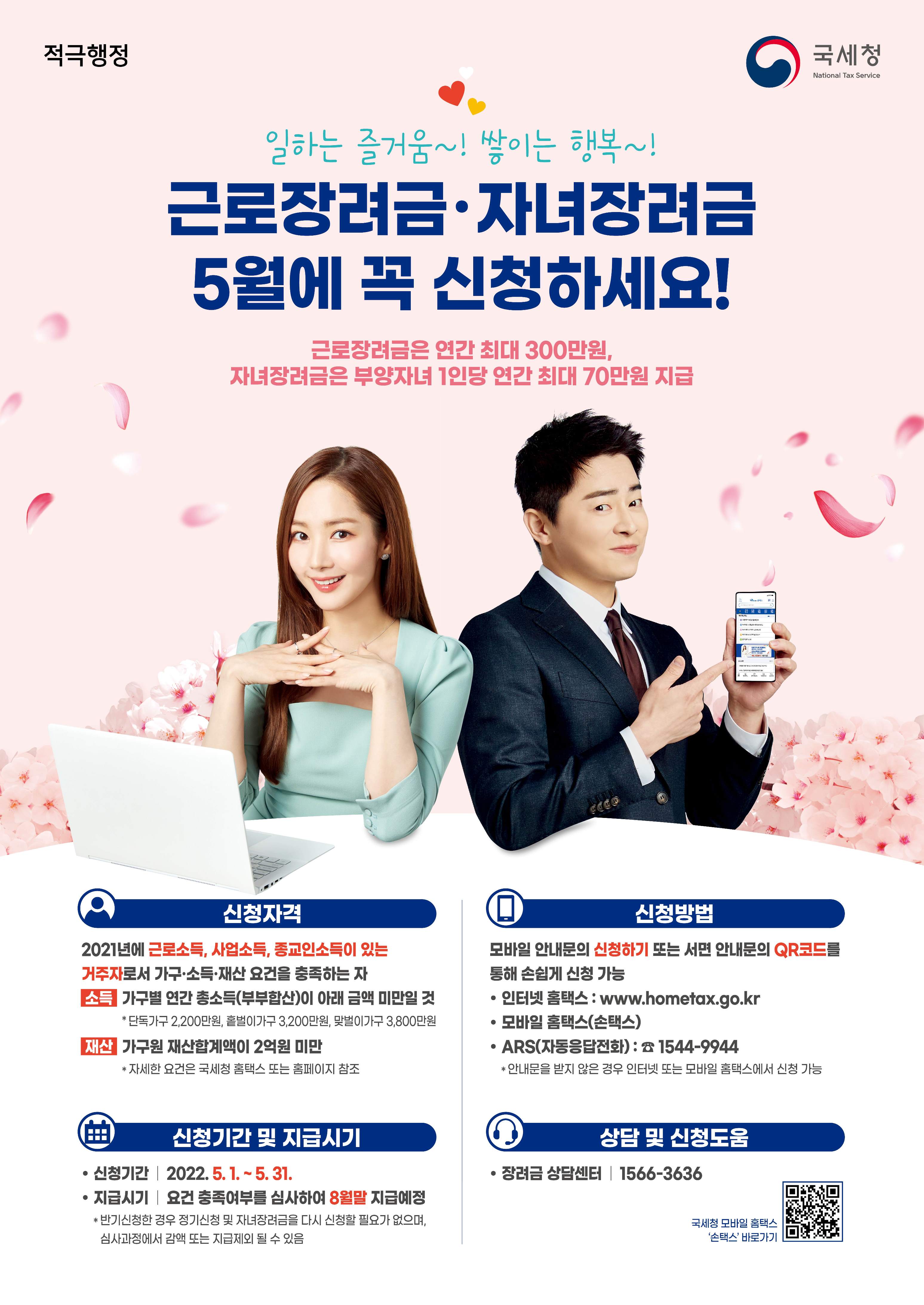 근로·자녀 장려금 신청안내 - 신청기간 : 2022.5.1.~5.31. - 지급시기 : 요건 충족여부를 심사하여 8월말 지급예정