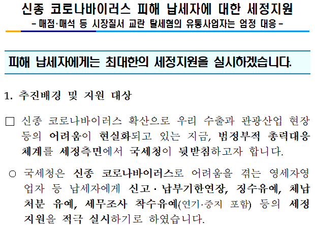 신종 코로나바이러스 피해 납세자에 대한 세정지원