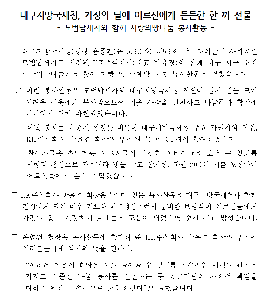 대구지방국세청, 가정의 달에 어르신에게 든든한 한 끼 선물