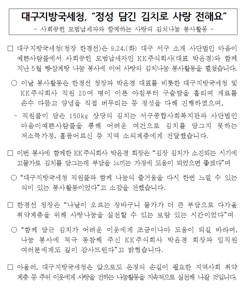대구지방국세청, 사회공헌 모범납세자와 함께하는 사랑의 김치 나눔