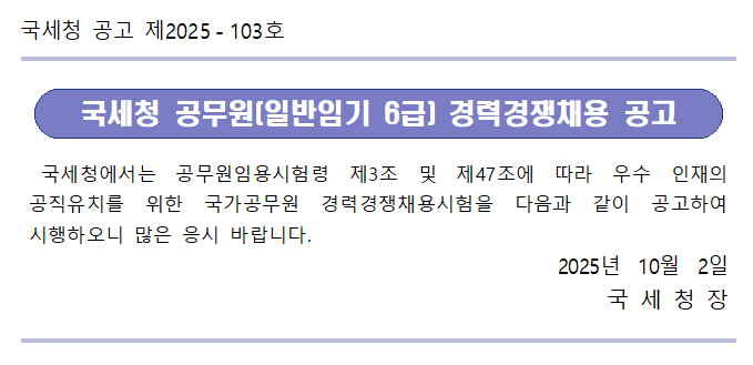 국세청 일반임기제공무원(6급, 세무서 납보실장) 채용 일괄 공고