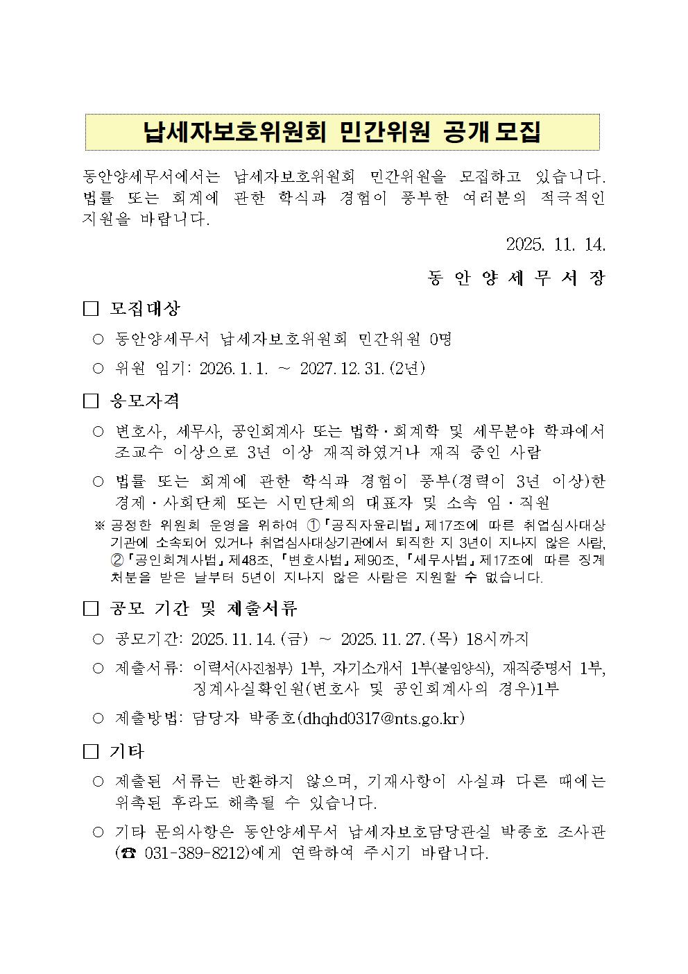 동안양세무서 납세자보호위원회 민간위원 공개모집