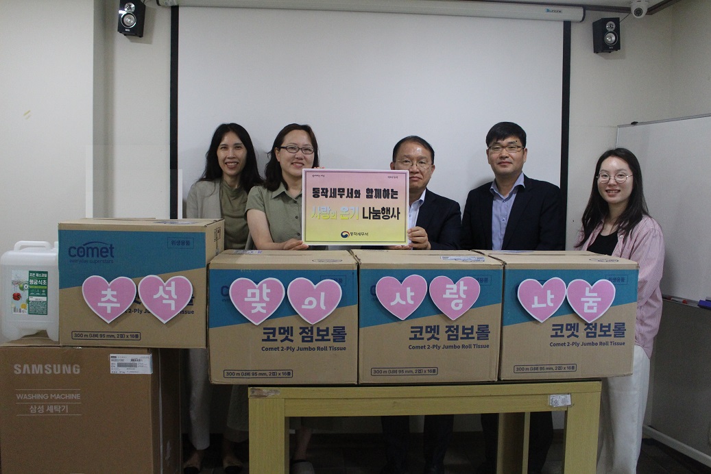 동작세무서는 추석 명절을 맞아 2025.9.24(수) 관내 아동사회복지시설인 ‘시온원'에 방문하여 위문 물품을 전달하고 이웃사랑을 실천하였습니다.