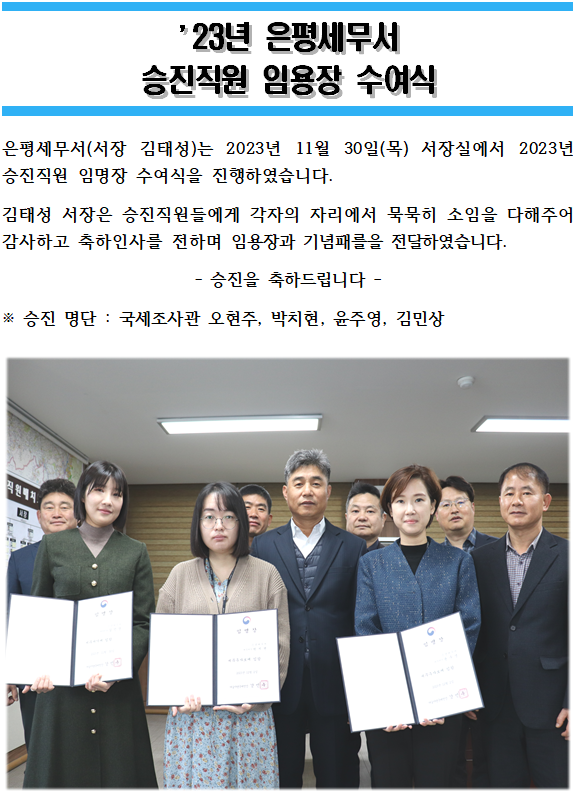 ’23년 은평세무서 승진직원 임용장 수여식 은평세무서(서장 김태성)는 2023년 11월 30일(목) 서장실에서 2023년 승진직원 임명장 수여식을 진행하였습니다. 김태성 서장은 승진직원들에게 각자의 자리에서 묵묵히 소임을 다해주어 감사하고 축하인사를 전하며 임용장과 기념패를을 전달하였습니다. - 승진을 축하드립니다 - ※ 승진 명단 : 국세조사관 오현주, 박치현, 윤주영, 김민상