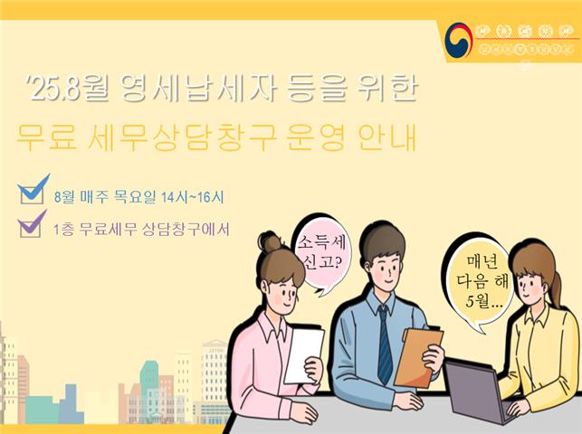 강남세무서에서 8월 「무료세무상담창구」를 운영하게 되어 일정을 공지하오니,
