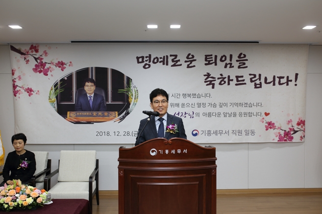 2018년 12월 28일(금) 기흥세무서 초대 김광규 서장님의 퇴임식이 있었습니다. 서장님은 직원들에게 기흥세무서를 잘 이끌어 줄 것을 당부하였고,직원들은 김광규 서장님의 앞날을 축하하였습니다. 다시한번 김광규 서장님의 그동안의 노고에 대해 깊은 감사드립니다.