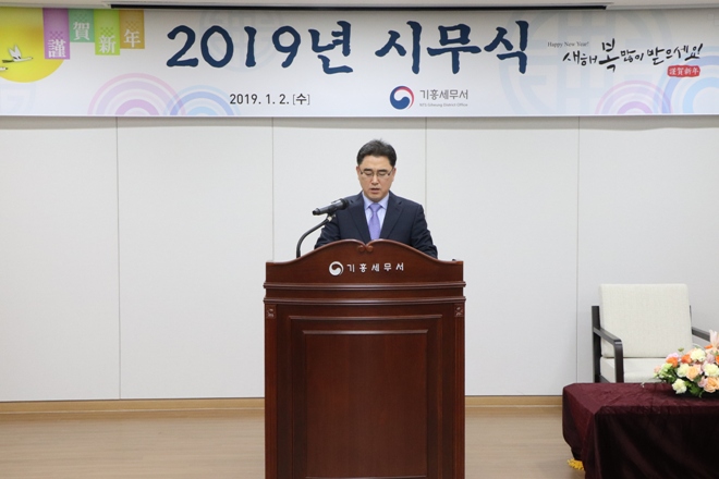 2019년 1월 2일(수) 김진우 기흥세무서장과 전 직원은 기흥세무서 2층 대강당에서 2019년 시무식을 가졌습니다.이날 김진우 기흥세무서장은 국세청장 신년사를 대독하고, 2018년 하반기 모범공무원에 대하여 포상을 수여하였으며, 전 직원들과 일일이 악수하며 신년 인사를 건넸습니다.