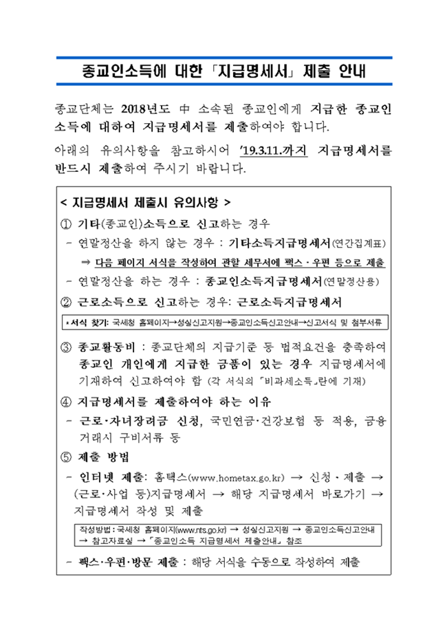 종교인 소득에 대한 지급명세서 제출 안내