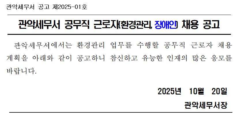 관악세무서 공무직 근로자(환경관리, 장애인) 채용 공고