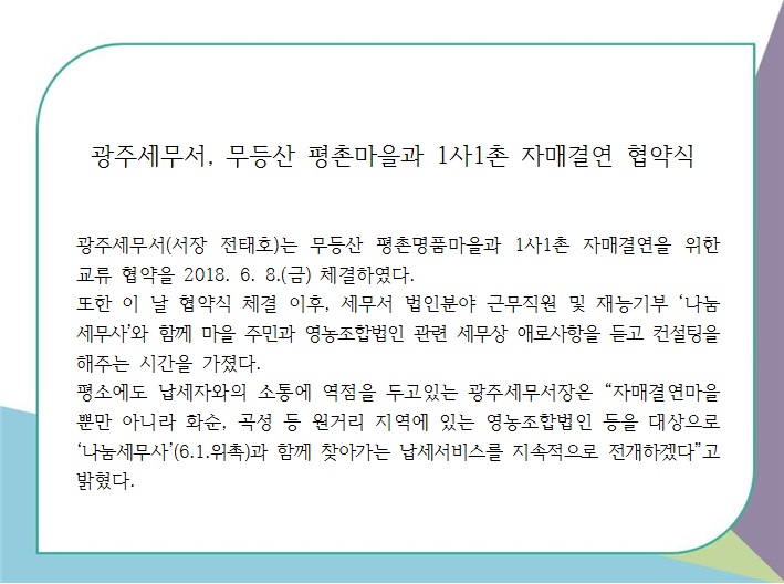 광주세무서, 무등산 평촌마을과 1사1촌 자매결연 협약식