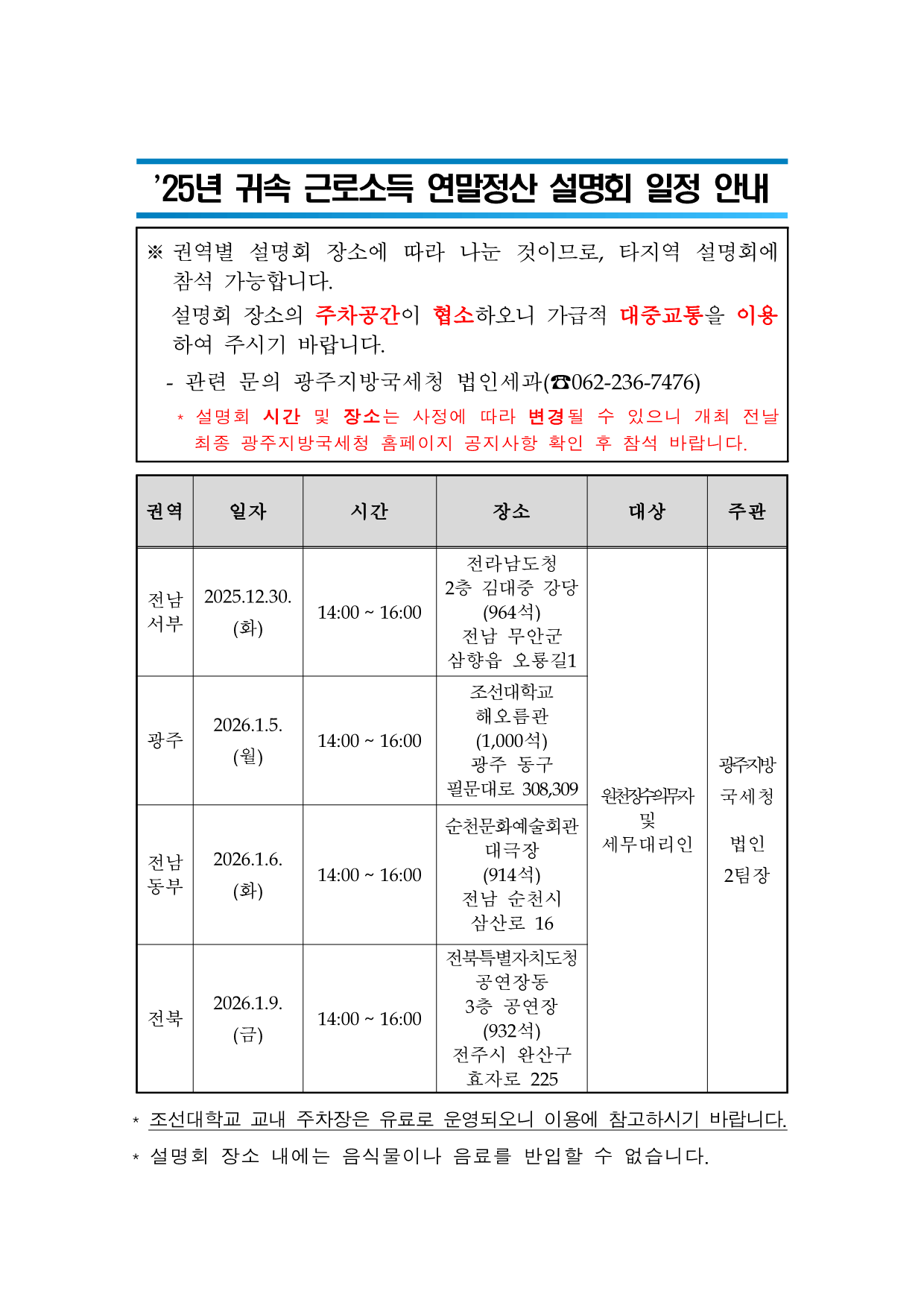 ’25년 귀속 근로소득 연말정산 설명회 일정 안내