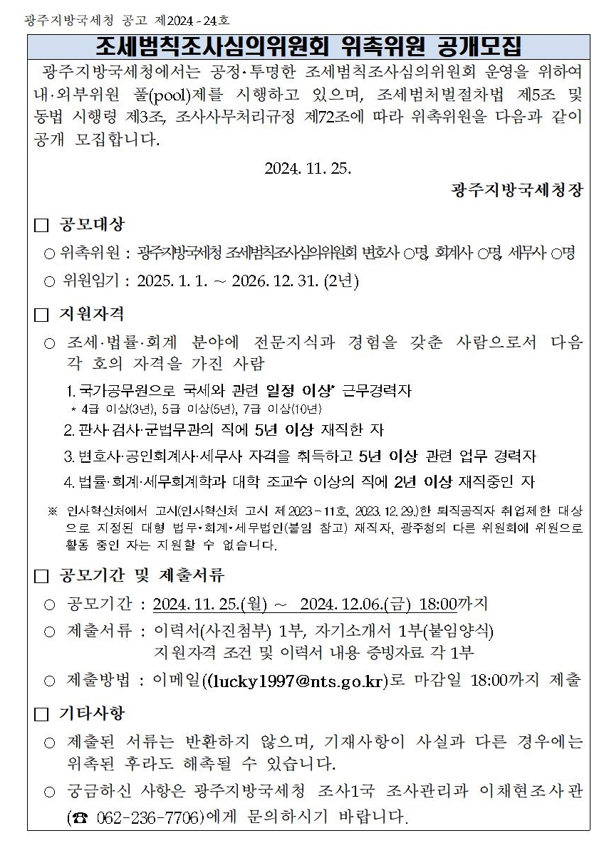 광주지방국세청에서는 공정・투명한 조세범칙조사심의위원회 운영을 위하여 내·외부위원 풀(pool)제를 시행하고 있으며, 조세범처벌절차법 제5조 및 동법 시행령 제3조, 조사사무처리규정 제72조에 따라 위촉위원을 다음과 같이 공개 모집합니다.