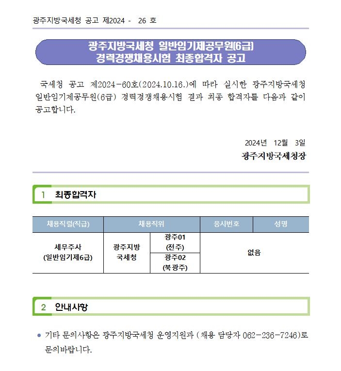 광주지방국세청 일반임기제공무원(6급) 경력경쟁채용시험 최종합격자 공고 국세청 공고 제2024-60호(2024.10.16.)에 따라 실시한 광주지방국세청 일반임기제공무원(6급) 경력경쟁채용시험 결과 최종 합격자를 다음과 같이 공고합니다. 2024년 12월 3일 광주지방국세청장