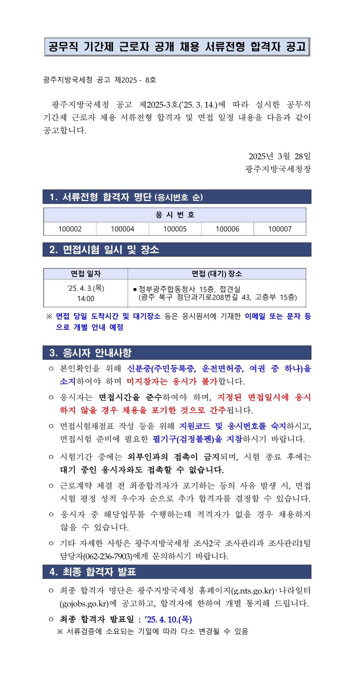 광주지방국세청 공고(서류전형 합격자 결정 및 면접시험 안내).hwp