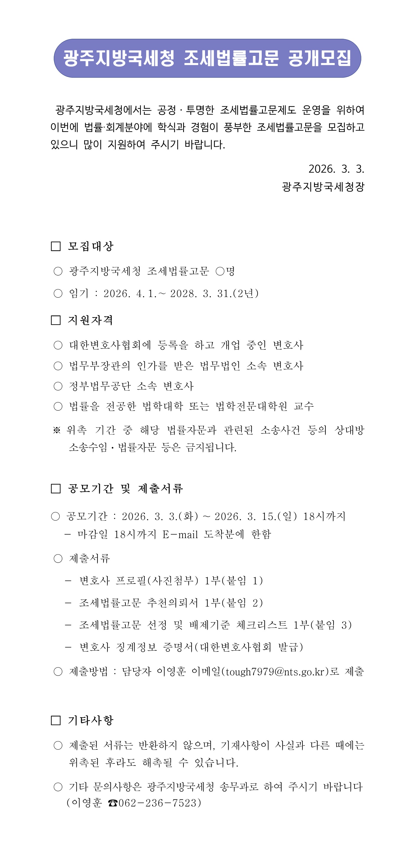 광주지방국세청 조세법률고문 공개모집