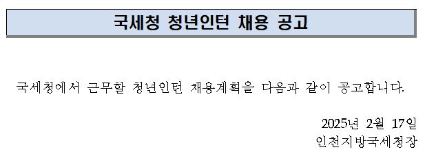 인천지방국세청 청년인턴 채용관련하여 공고하오니 자세한 내용은 첨부파일 확인부탁드립니다.