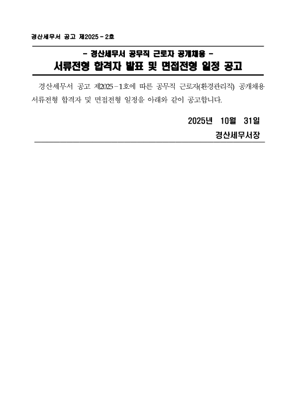 ★3_경산세무서 공무직 근로자 공개채용 서류전형 합격자 발표 및 면접전형 일정 공고.hwp