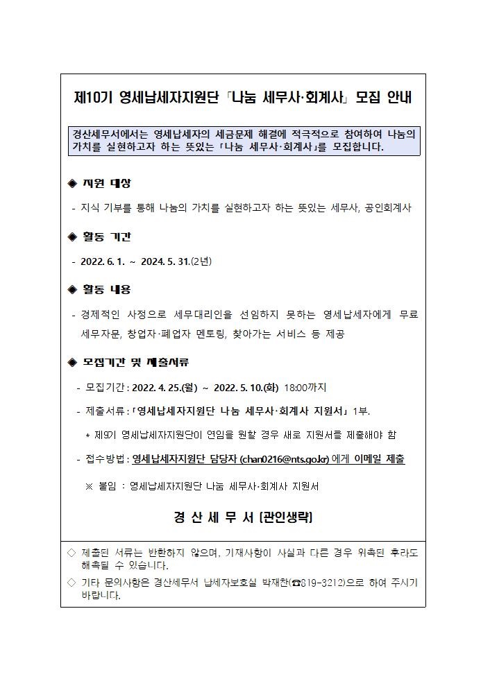 제10기 영세납세자지원단 「나눔 세무사・회계사」 모집 안내