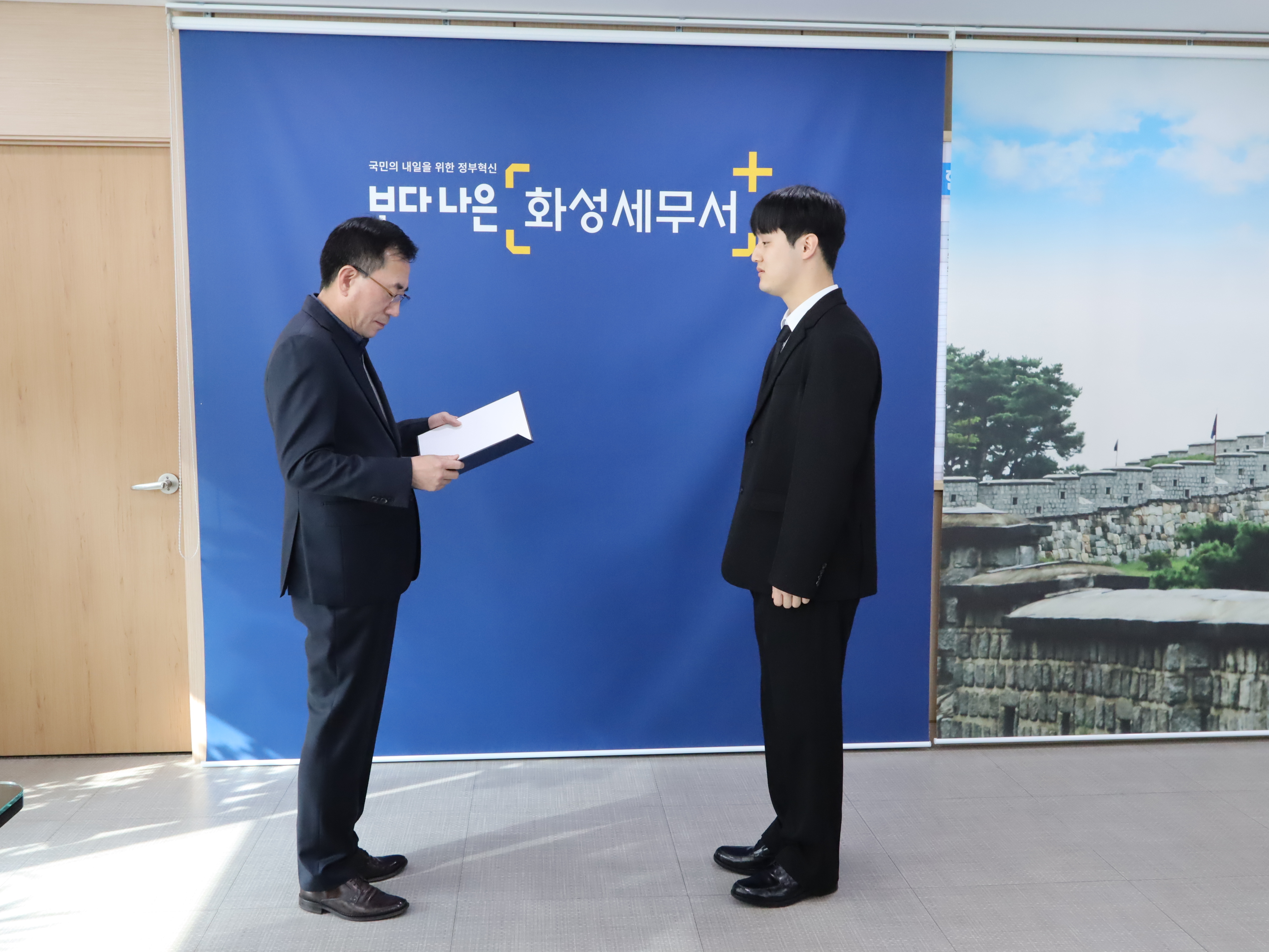 서장님께서는 '오늘의 설렘을 잊지 않고 성실하고 청렴한 국세조사관이 되어주길 응원합니다.' 며 따뜻한 격려를 전하셨습니다.
