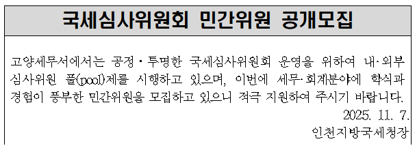 국세심사위원회 민간위원 공개모집 양세무서에서는 공정ㆍ투명한 국세심사위원회 운영을 위하여 내‧외부 심사위원 풀(pool)제를 시행하고 있으며, 이번에 세무‧회계분야에 학식과 경험이 풍부한 민간위원을 모집하고 있으니 적극 지원하여 주시기 바랍니다. 2025. 11. 7. 인천지방국세청장