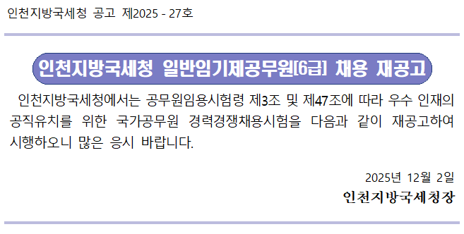 인천지방국세청 공고 제2025-27호 인천지방국세청 일반임기제공무원[6급] 채용 재공고 인천지방국세청에서는 공무원임용시험령 제3조 및 제47조에 따라 우수 인재의 공직유치를 위한 국가공무원 경력경쟁채용시험을 다음과 같이 재공고하여 시행하오니 많은 응시 바랍니다. 2025년 12월 2일 인천지방국세청장