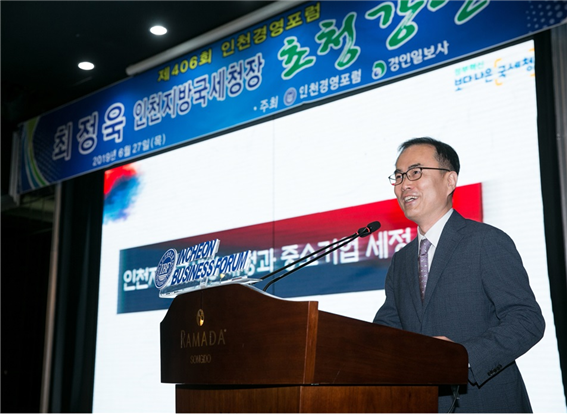 최정욱 인천지방국세청장은 지난 6월 27일 인천경영포럼 제406회 조찬강연회에서‘인천지방국세청 개청과 중소기업 세정 지원이라는 주제로 강연을 하였습니다.