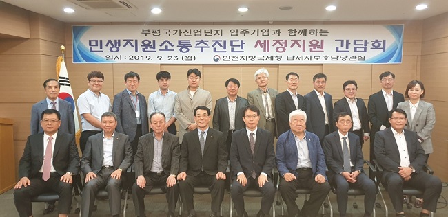 인천지방국세청(청장 최정욱) 민생지원소통추진단은 ’19.9.23.(월) 인천광역시 부평구 청천동 소재 부평국가산업단지를 방문하여 중소 기업 대표 등과 세정지원 간담회를 개최하였습니다.