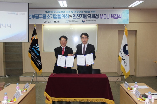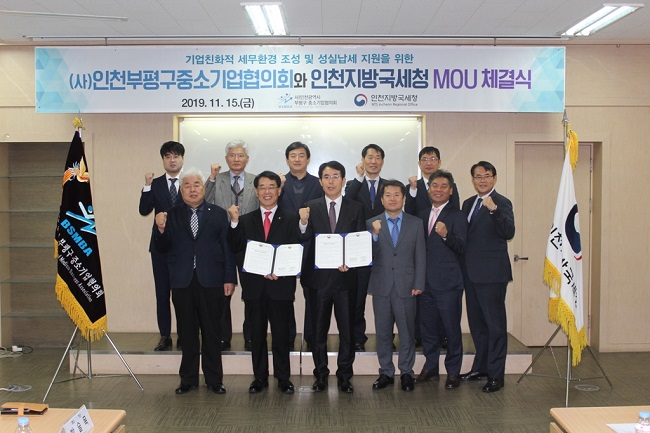 인천지방국세청은 ’19. 11. 15(금) 인천광역시 부평구 청천동 소재 부평국가산업단지에서 정연주 납세자보호담당관과 ㈔인천광역시 부평구 중소기업협의회 박술목 회장이 참석한 가운데 기업친화적 세무환경 조성 및 성실납세지원에 관한 MOU를 체결하였습니다.