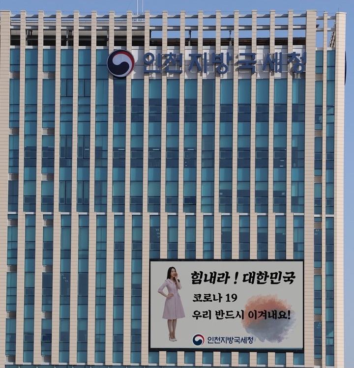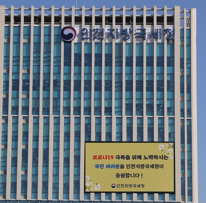 인천지방국세청(청장 구진열)은 「코로나19」사태로 어려움을 겪고 있는 국민들을 위하여 청사 건물 외벽에 설치된 대형 전광판을 통해 대국민 응원 메시지를 3월부터 송출하고 있습니다.
