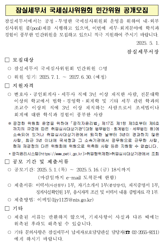 잠실세무서 국세심사위원회 민간위원 공개모집