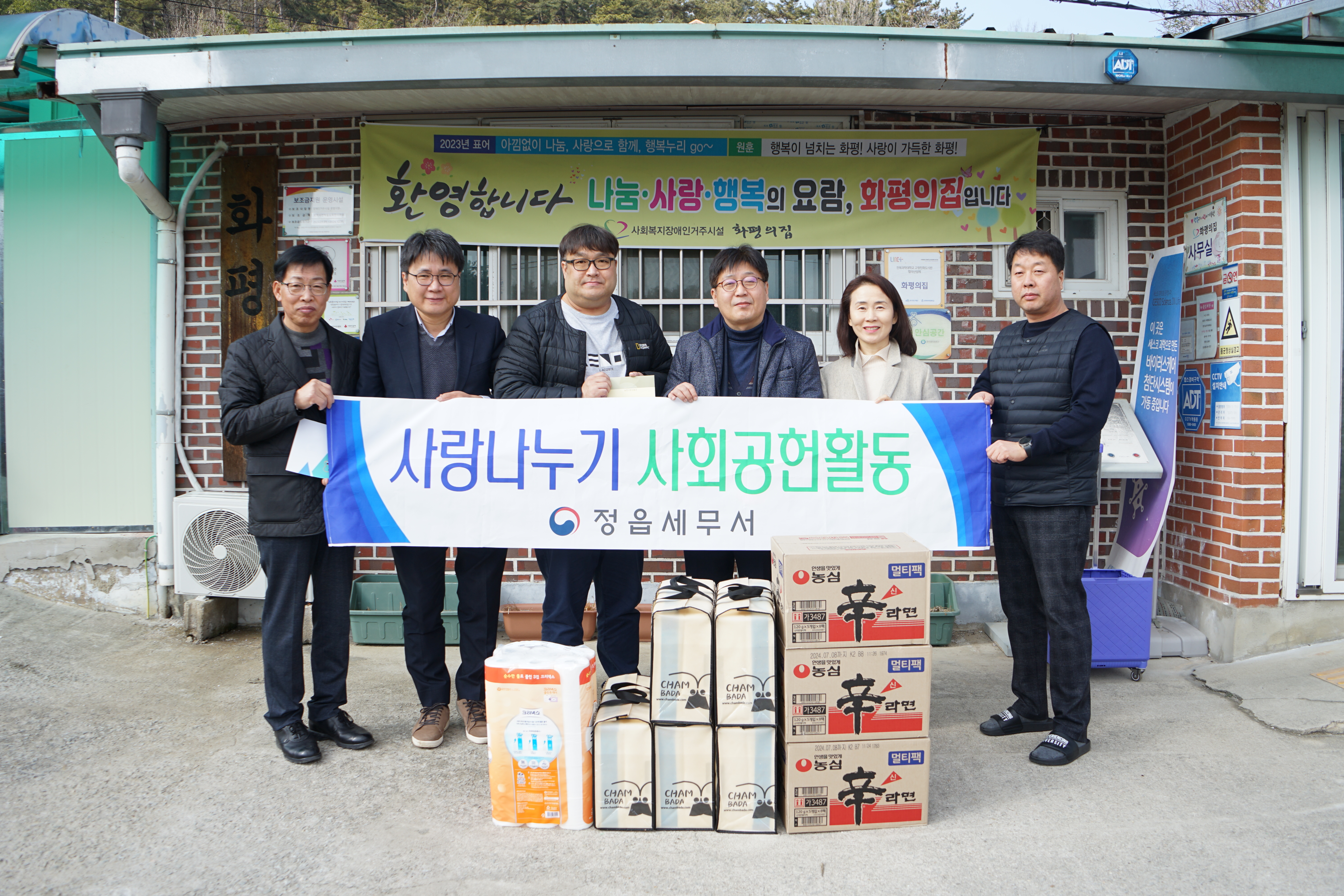 2025.03.05.정읍세무서(서장 송평근)은 2025년 1월 23일(목)에 설명절을 맞아 주위에 있는 이웃에게 사랑을 실천하기 위하여 사회복지시설(정읍 화평의집, 고창 야고바의집)을 방문하여,직원들과 함께 마련한 성금과 위문품을 전달하였습니다.앞으로도...