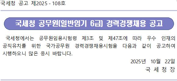 국세청 공고 제2025-108호 국세청 공무원(일반임기 6급) 경력경쟁채용 공고 국세청에서는 공무원임용시험령 제3조 및 제47조에 따라 우수 인재의 공직유치를 위한 국가공무원 경력경쟁채용시험을 다음과 같이 공고하여 시행하오니 많은 응시 바랍니다. 2025년 10월 22일 국 세 청 장