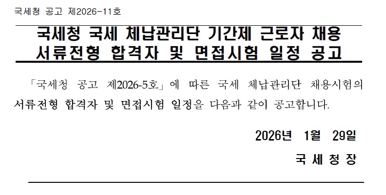 국세청 국세 체납관리단 기간제 근로자 채용 서류전형 합격자 및 면접시험 일정 공고(공고2026-11호).pdf
