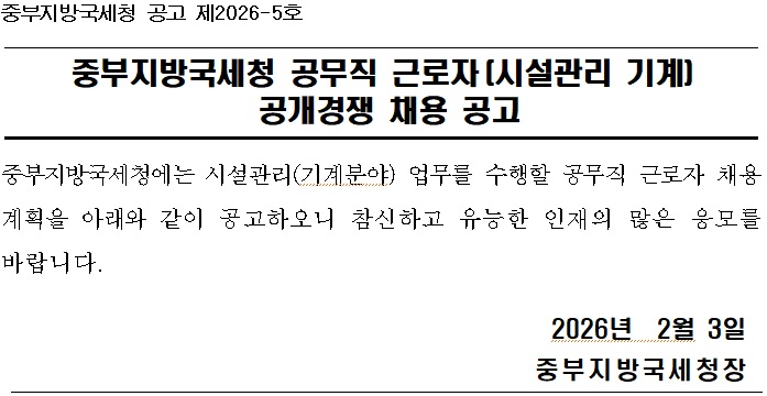 중부지방국세청 공고 제2026-5호 중부지방국세청 공무직 근로자(시설관리 기계) 공개경쟁 채용 공고 중부지방국세청에는 시설관리(기계분야) 업무를 수행할 공무직 근로자 채용 계획을 아래와 같이 공고하오니 참신하고 유능한 인재의 많은 응모를 바랍니다. 2026년 2월 3일 중부지방국세청장