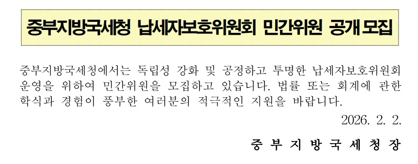 중부지방국세청 납세자보호위원회 민간위원 공개모집 공고